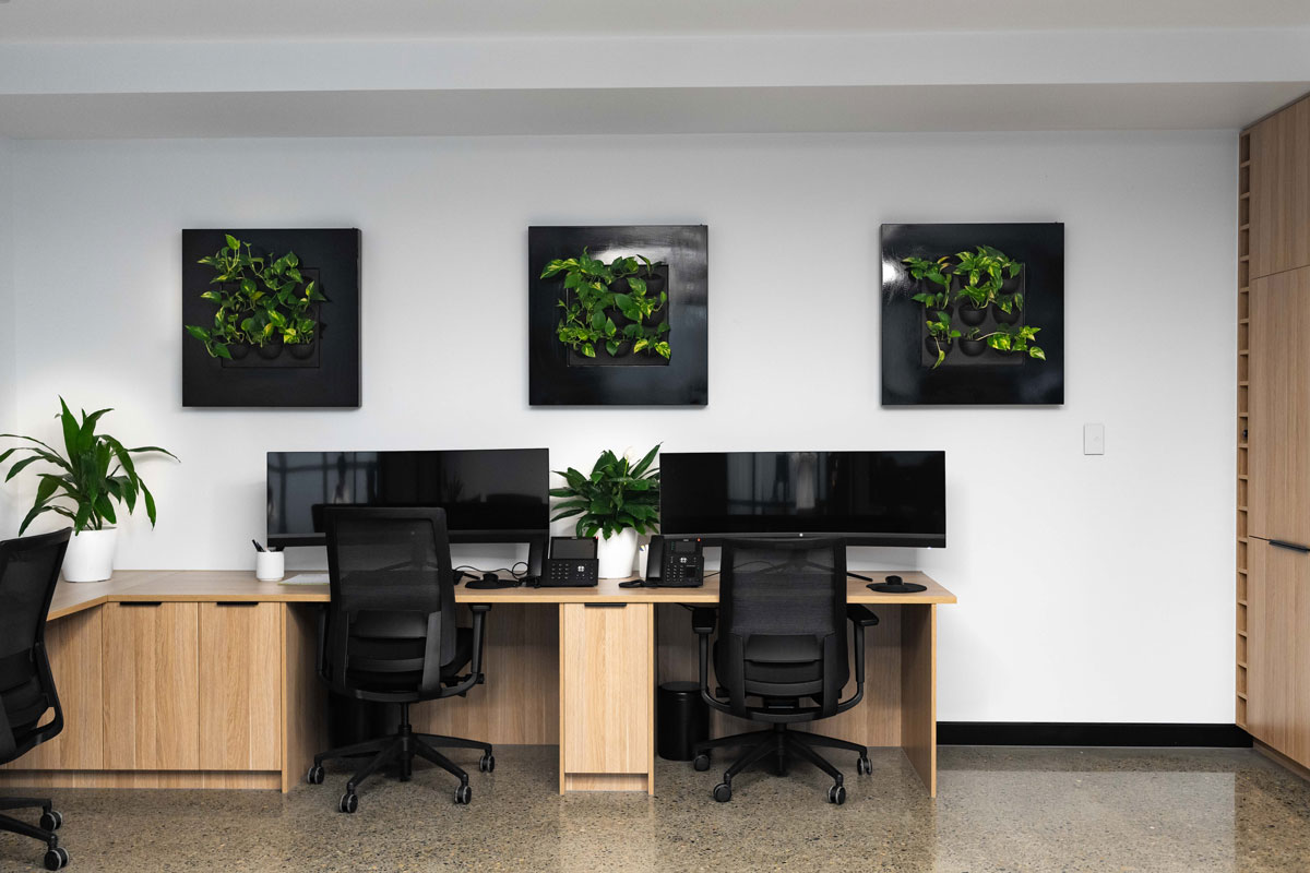 A premium Evergreen Greenwall forms the backdrop to the desk, framing the custom Axolotl Applied Bronze Metal signage with a textured, brown Florentine-aged finish—bringing both branding and biomimicry into play. In the work zones, Polytec Natural Oak Woodmatt is used across office desks and cabinetry, softened by MOMO Ferrara Lip Pull handles in matt black for a minimalist aesthetic.