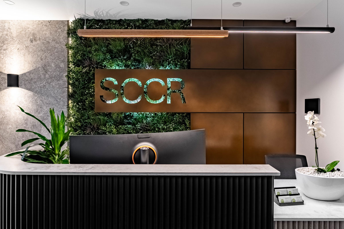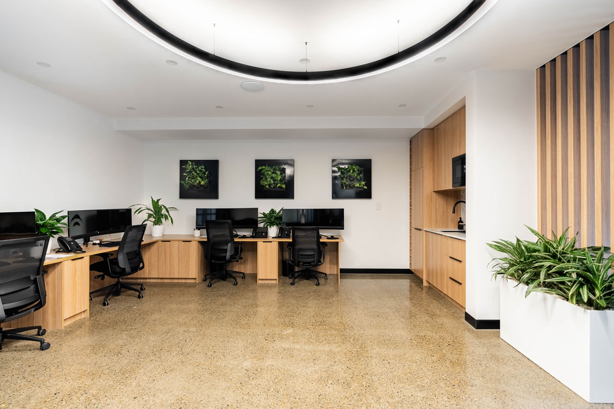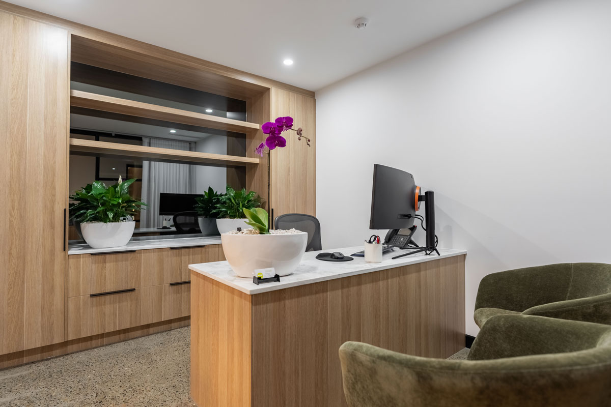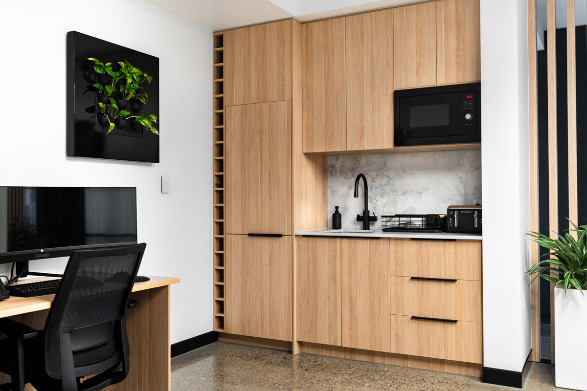 The SCCR commercial space is a refined showcase of contemporary joinery and natural finishes, thoughtfully curated to elevate a professional environment. At the forefront, the reception area is anchored by a custom-built front desk featuring Polytec Black Woodmatt joinery and Black Woodmatt Steccawood Battens in a half-round profile, contrasted by the warmth of Natural Oak Woodmatt Steccawood Battens wrapping around key elements. The desk is topped with AC Stone’s Stormclouds, which carries through to the kitchenette and executive office, offering a cohesive stone finish throughout.