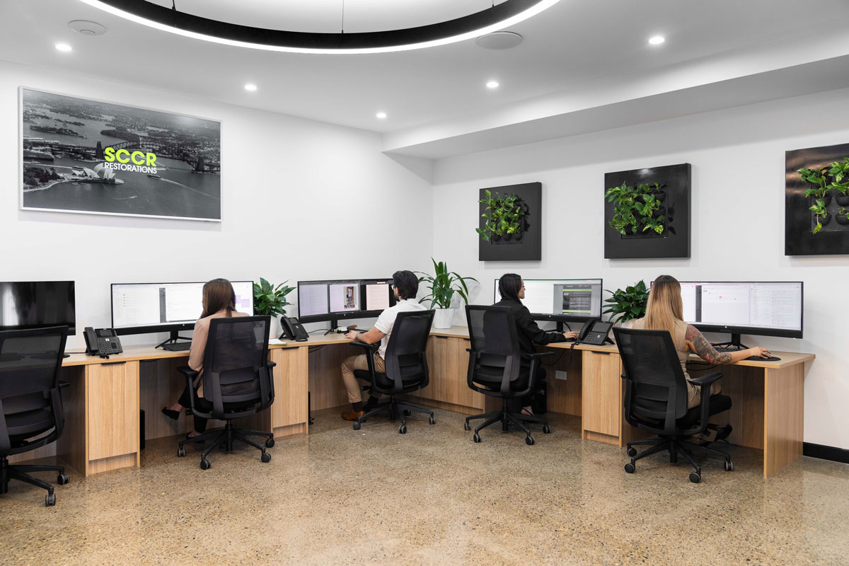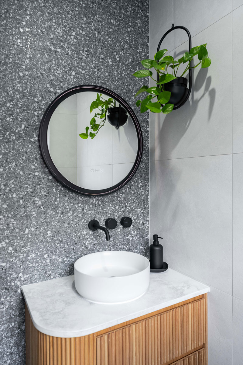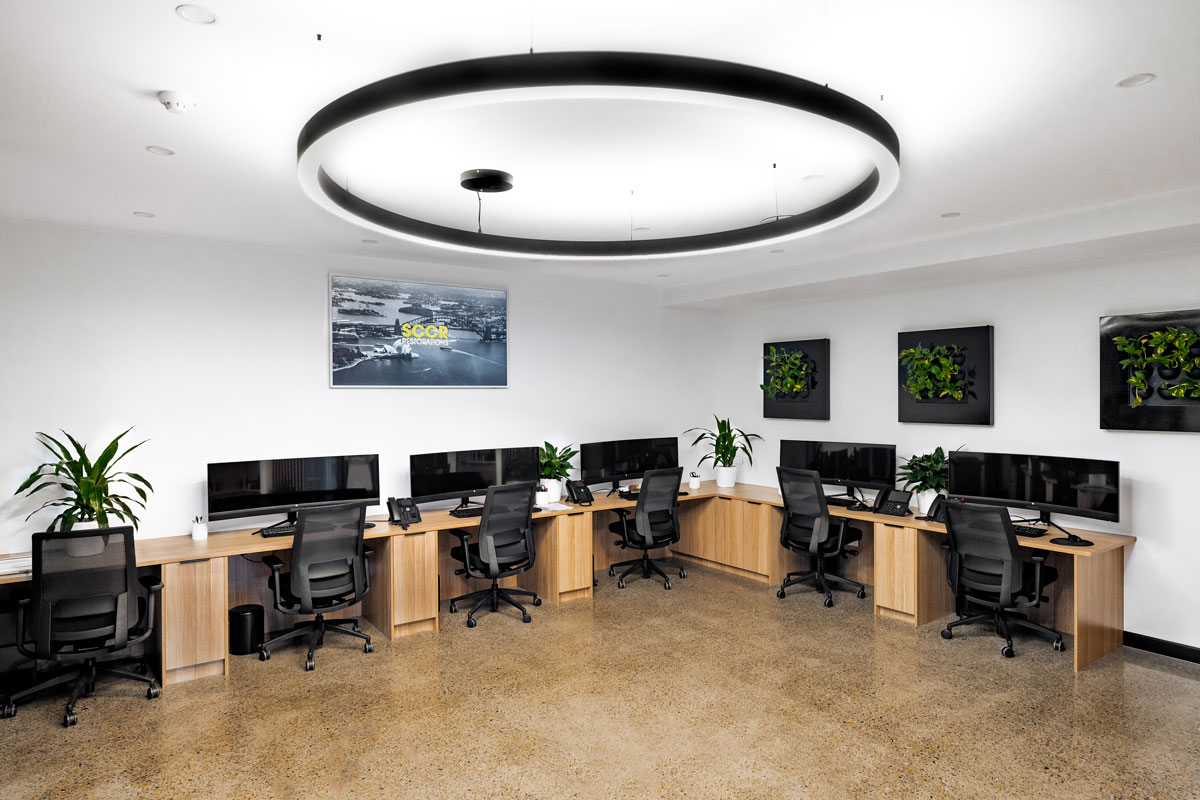 The bathroom vanities continue the language of design, clad in Natural Oak Steccawood Battens and finished with the same Stormclouds stone, ensuring continuity across all touchpoints. The considered layering of dark tones, natural textures, and refined detailing reinforces SCCR’s identity as a contemporary, high-functioning business space